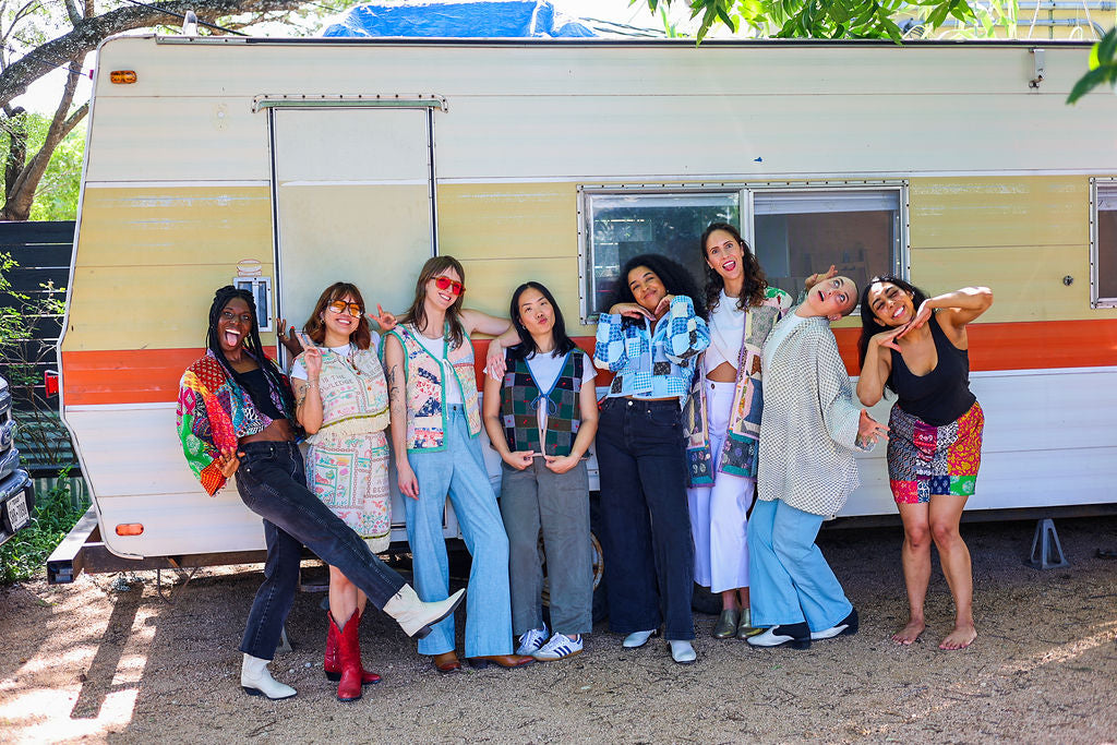 Each garment is handcrafted in Austin, Texas, by our talented team of sewists, all of whom are paid fair wages. We upcycle vintage quilts, giving them a second life as unique, wearable pieces of art. Every stitch is done with care, ensuring quality while honoring the original craftsmanship of the quilt.