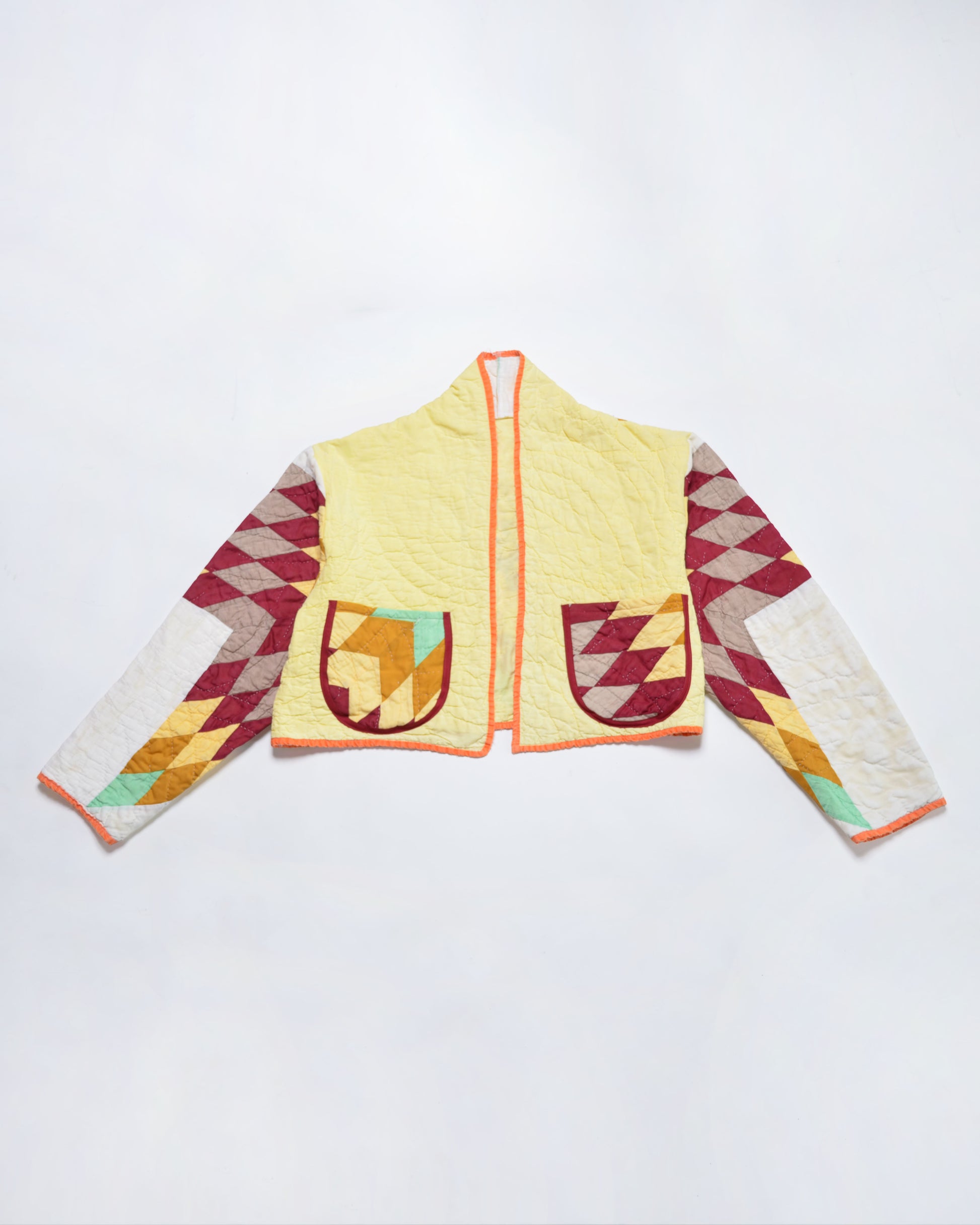The Yellow Psychedelic Star Quilt Cropped Jacket is a statement piece that carries history into the future. Upcycled from a vintage quilt, this jacket bursts with energy through its bold yellow and white chevron pattern. The cropped fit adds a modern touch, making it perfect for layering over your favorite outfit. Every quilt has a story, and this one is ready for a new adventure. Handmade in Austin, Texas, with ethical wages and sustainable practices—will you be the one to wear its next chapter?